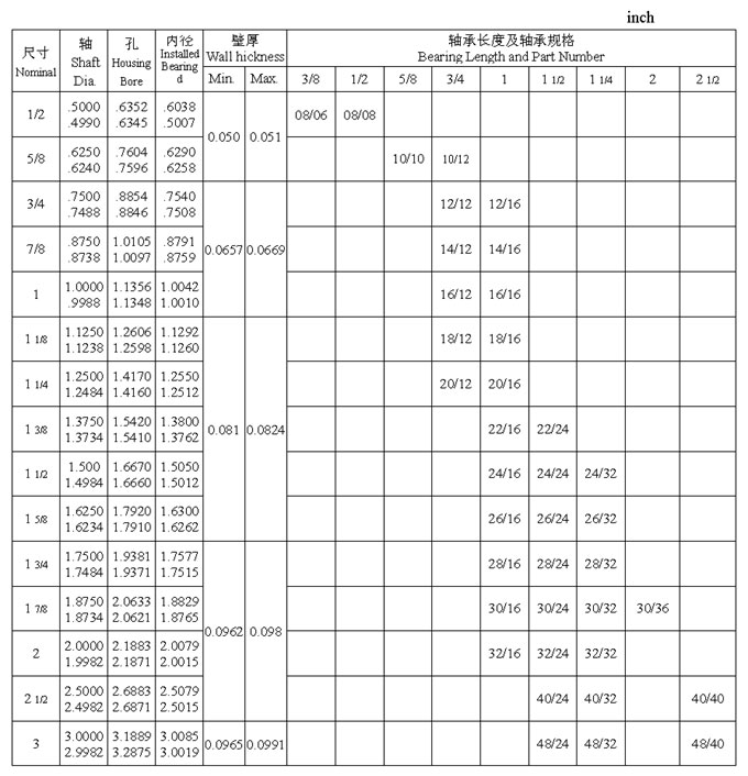 JS2 系列軸承英制尺寸(inch)