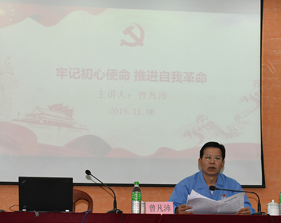 ????2019年11月8日下午,公司黨委書記、董事長曾凡沛在公司俱樂部一樓講授《牢記初心使命 推進自我革命》專題黨課,公司領導、各黨總支(黨支部)書記及支委委員、中層干部及主題教育領導小組辦公室成員聆聽學習。市委第七巡回指導組韓毅到會指導。