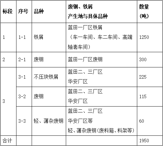 (1)招標人藍田一廠區(地址:福建省漳州市龍文區龍祥北路8號)廢鋼包含鍛工車間生產過程中產生的鍛造料芯、廢套圈、料段等和車工一車間、車工二車間、高端軸套車間生產過程中產生的廢套圈等。