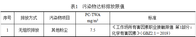 砂帶機產生的粉塵經處理后達到《大氣污染物排放標準》(GB16297-1996)表2二級標準要求,即顆粒物排放濃度≤120mg/m3,尾氣接至窗戶外,同時增加百葉窗裝飾。同時,車間內無組織排放粉塵能符合《工作場所有害因素職業接觸限值 第1部分:化學有害因素》(GBZ2.1-2019)相應標準要求,具體見下表1。