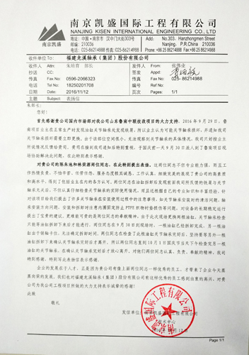 近日,一封表揚(yáng)信寄到了公司國內(nèi)市場部。原來,為感謝公司技術(shù)員陳朱池、林榮源提供的細(xì)致貼心的技術(shù)服務(wù),南京凱盛國際工程有限公司(下稱南京凱盛)特意寄來了這封表揚(yáng)信。