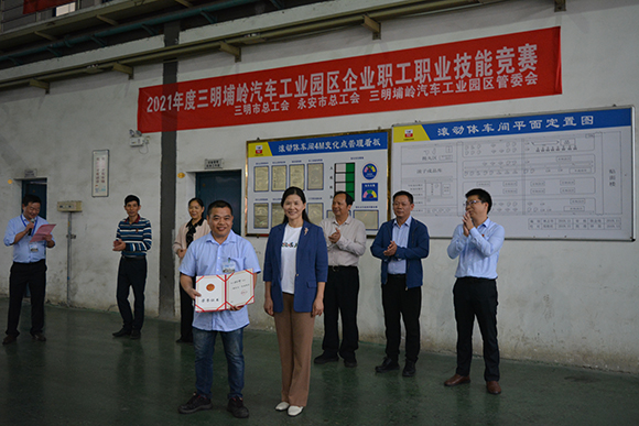 ▲三明市總工會(huì)、永安市總工會(huì)、三明埔?guī)X汽車(chē)工業(yè)園區(qū)管委會(huì)領(lǐng)導(dǎo)及龍軸集團(tuán)永軸公司領(lǐng)導(dǎo)班子與獲獎(jiǎng)選手合影留念