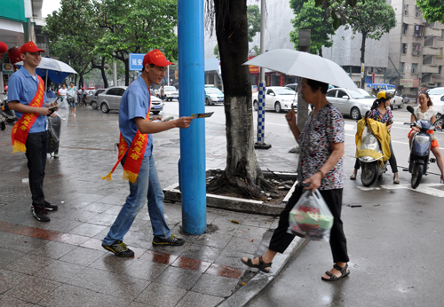 (圖a)志愿者深入到龍軸新村延安北路街頭,為過往行人分發(fā)安全生產(chǎn)宣傳資料。