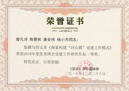 近日,《國企》雜志編輯部依據文章主題、文字闡述等質量評審要素,對刊載于2018年度《國企·黨建》雜志的文章進行評審,按黨建理論研究、工作研究、宣傳報道3大類評選出108篇優秀作品。由公司黨委書記、董事長曾凡沛主持撰寫的《探索構建“同心圓”黨建工作模式》榮獲2018年度優秀國企黨建工作研究作品一等獎。