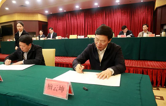 ????1月8日晚,省人大常委會副主任、市委書記檀云坤,市長劉遠代表市委、市政府與各縣(市、區)、開發區(投資區)黨政主要領導及市直有關單位主要負責人,簽訂(下達)了2019年綜治(平安建設)責任書。市委副書記、政法委書記阮開森主持會議并通報全市落實2018年度黨政領導綜治責任書情況。