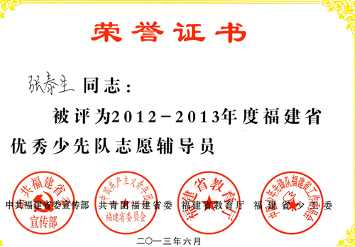 張泰生同志1975年7月參加工作,大專學歷,現任福建龍溪軸承(集團)股份有限公司黨委副書記兼工會主席,作為一個少先隊志愿輔導員,他熱誠服務,積極引導廣大少年兒童勤奮學習、快樂生活、從小樹立遠大理想,使漳州市通北中心小學全體少先隊員的素質得到全面發展,促進他們健康快樂成長,為通北中心小學少先隊的工作盡自已一份的微簿之力。近幾年來先后獲“福建省優秀企業思想政治工作者”、“第三屆全省企業關心支持青年工作優秀黨政領導”、“熱心支持工會工作的黨政領導干部”等光榮稱號。