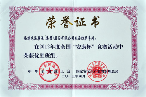 | 國家級 | 2013年 | 全國“安康杯”競賽優(yōu)勝班組(表面防護(hù)車間) | 中國總工會(huì),國家安全生產(chǎn)監(jiān)督管理總局 |